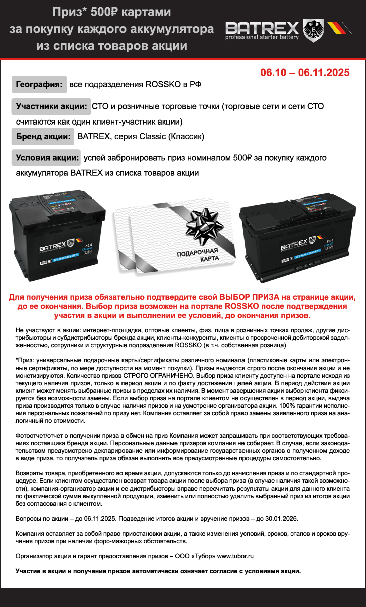 06.10 – 06.11.2025 Акция «Приз* 500₽ картами за покупку каждого аккумулятора BATREX из списка товаров акции»